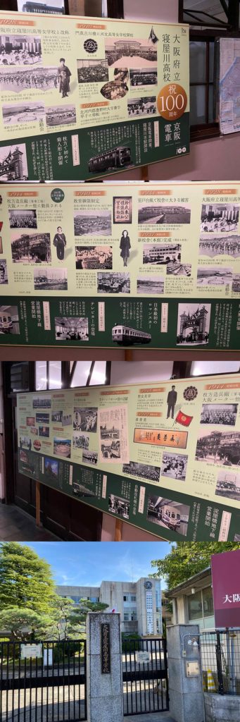 本館は昭和12年(1937)の完成で築85年の歴史ある建物。正面玄関には寝屋川高校の歴史をたどる大型パネルが展示されている。京阪電鉄と創立年が同じということで、パネル下部には京阪の歴史が並んでいる。